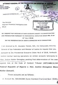 See Exclusive letter from AGF directing the briefing freezing of CJN Onnoghen‘s accounts.